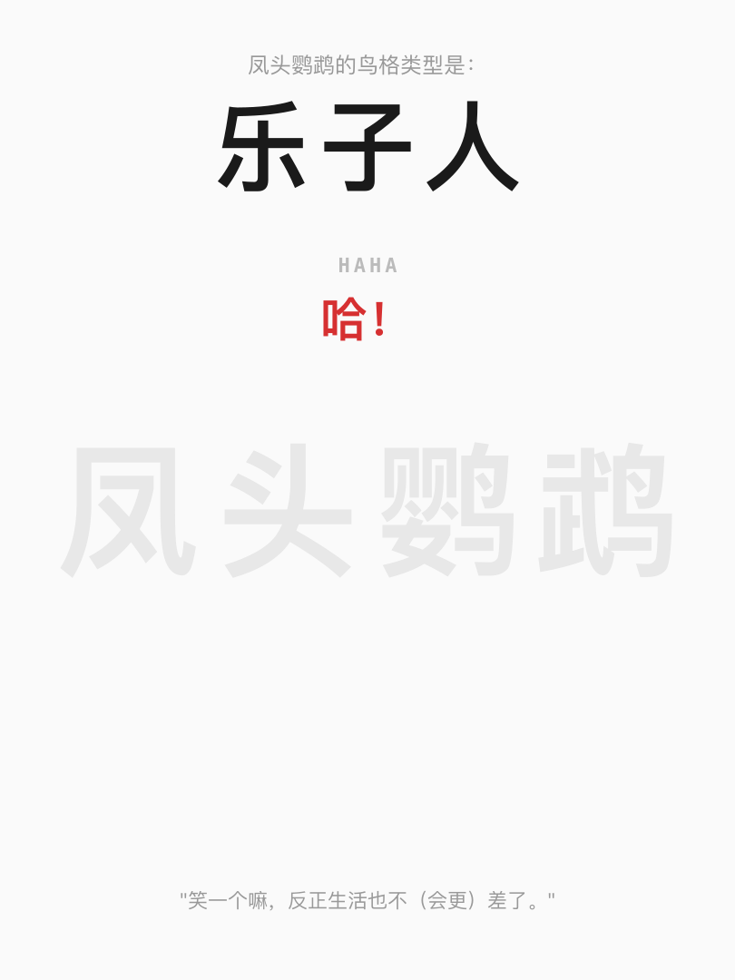 凤头鹦鹉是鸟界公认的喜剧演员——会跳舞会搞怪永远在整活。 你也是。在你看来没有什么事情是严肃到不能笑一笑的。 你用幽默化解尴尬处理悲伤甚至应对危机。 但你一个人的时候有多安静——没人知道。